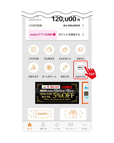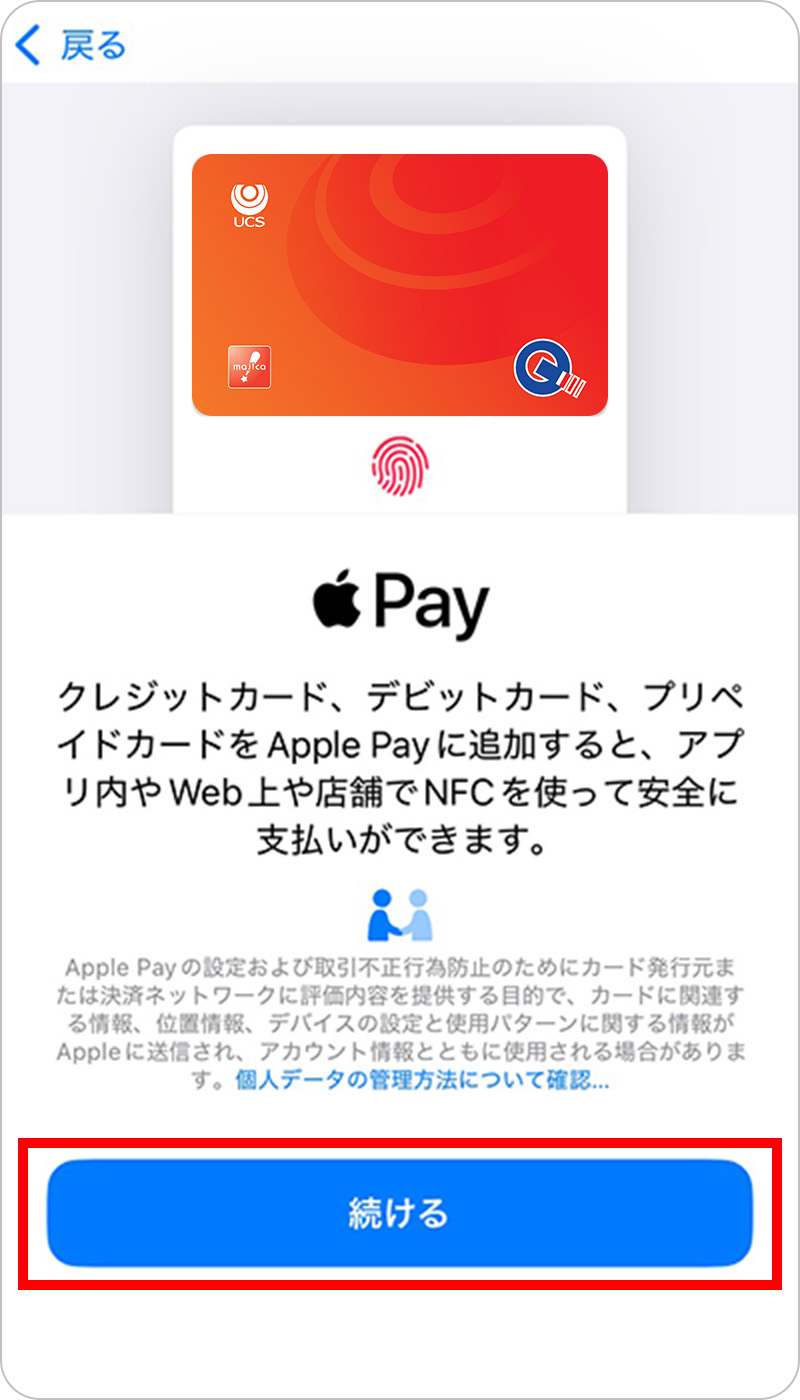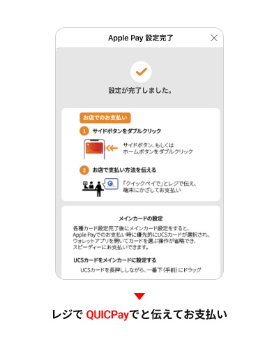 各種カード設定完了後にメインカード設定をすると、Apple Payでのお支払い時に優先的にUCSカードが選択され、