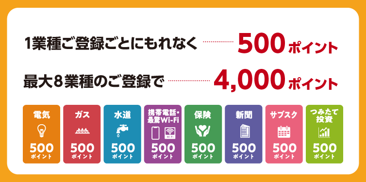 期間中、キャンペーンにご応募のうえ、対象加盟店へのクレジット支払いを新規ご登録・お支払いいただいた方へ1業種ごとに、もれなく500ポイントプレゼント!全8業種のご登録で最大4,000ポイントプレゼント!!