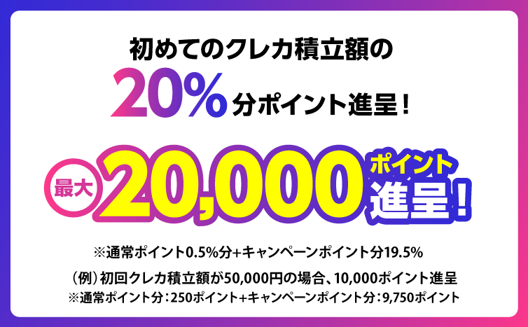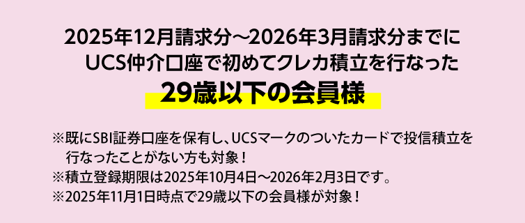 期間中、キャンペーンにご応募のうえ、UCS仲介口座で初めてUCSマークのついたカードでクレカ積立を行うと、初回クレカ積立額に対して20%ポイント進呈!
