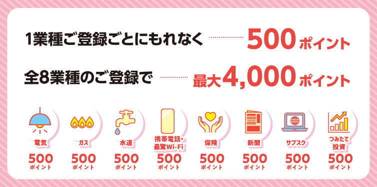 期間中、キャンペーンにご応募のうえ、対象加盟店へのクレジット支払いに新規ご登録・お支払いいただくと1業種ごとに、もれなく500ポイントプレゼント!全8業種の登録で最大4,000ポイントプレゼント!!