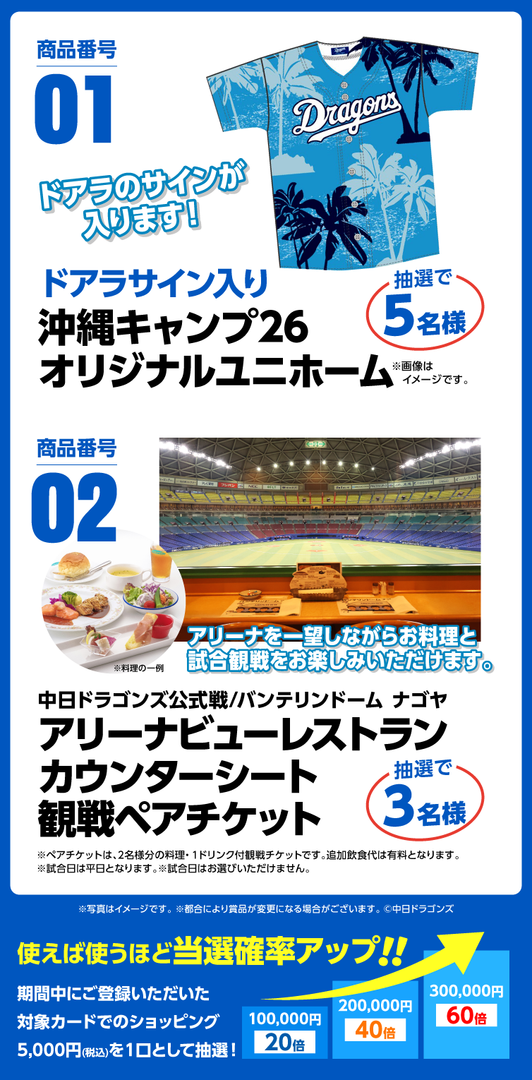 ※ご利用金額に応じて当選確率がアップします。さらにUCSドラゴンズカード会員様でUCSドラゴンズプレミアムご登録の場合、口数が2倍となります。
