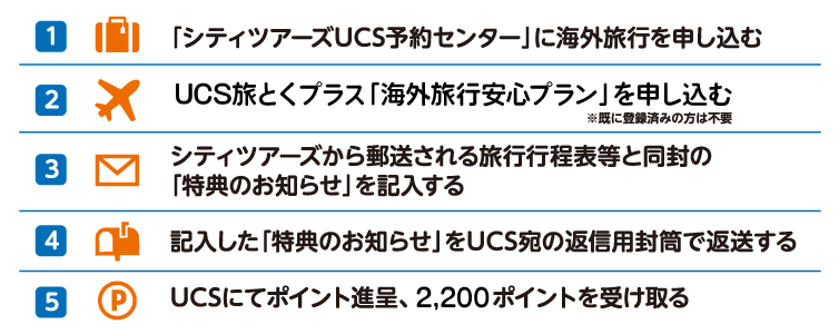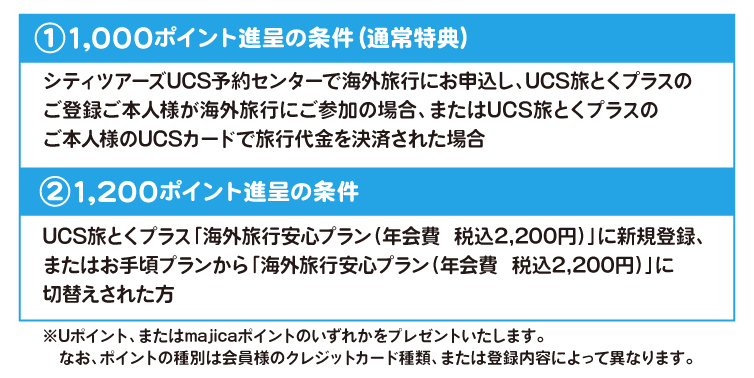 キャンペーン期間中に@シティツアーズUCS予約センターで海外旅行をお申込みされた場合1,000ポイント、かつAUCS旅とくプラス「海外旅行安心プラン」ご登録者の方はさらに1,200ポイント、合計2,200ポイント進呈します。