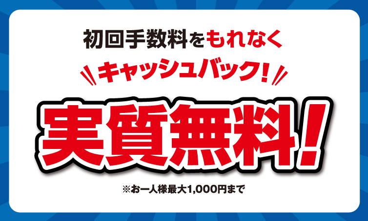 - ※キャッシュバックは初回の手数料のみとなります。キャッシュバックはお一人様最大1,000円までとなります。