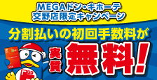 MEGAドン・キホーテ交野店にて、期間中、UCSマークのついたカードで分割払い(3回払い以上)ご利用で、もれなく初回の手数料をキャッシュバック!
