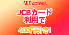 AliExpressで4,000円(税込)以上のお買い物時、JCBカードを利用すると400円引き