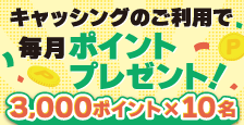 期間中、キャンペーンにご応募のうえ、各期間中にキャッシング(一括・キャッシングリボ・カードローン)を合計5万円以上ご利用いただいた方の中から、毎回抽選で10名様に3,000ポイントプレゼント!