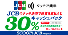 JCBのタッチ決済で対象の公共交通機関を利用すると、キャンペーン期間中の利用合計金額の30%をキャッシュバック(上限:500円相当)