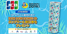 期間中にグアムホテル優待サイトからJCBカードを利用して対象ホテルをご予約・ご宿泊いただくと、各ホテルの特典に加えて、DON DON DONKIグアムの 「限定タンブラー引換券」と 「10%オフの特別割引クーポン」をプレゼント。 ※タンブラーの引き換えには、DON DON DONKIグアム店でJCBカードをご利用いただいた際の「レシート」のご提示が必要(最低購入金額の設定はございません。レシートは引き換え当日に買い物をされた分が対象) ※特別割引クーポンは、DON DON DONKIグアムでUS80ドル以上のJCBカードをご利用時に使用可能(酒類およびたばこ類にはご利用いただけません。)