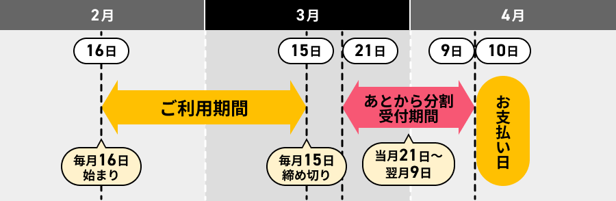 ご請求金額の確定前、確定後であとから分割の受付期間が異なります。詳しくは以下をご確認ください。
